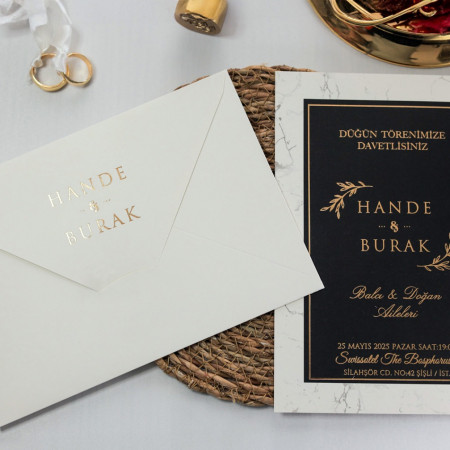 Bu üründe Zarf ve İç Kartında Altın Varak Yaldız Baskı kullanılmıştır.