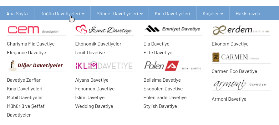 Ana Menüden İster Düğün Davetiyeleri yada Alt menüdeki Katalog isimlerinden Birini tıklayarak tüm ürünlerin listelenmesini sağlayın.