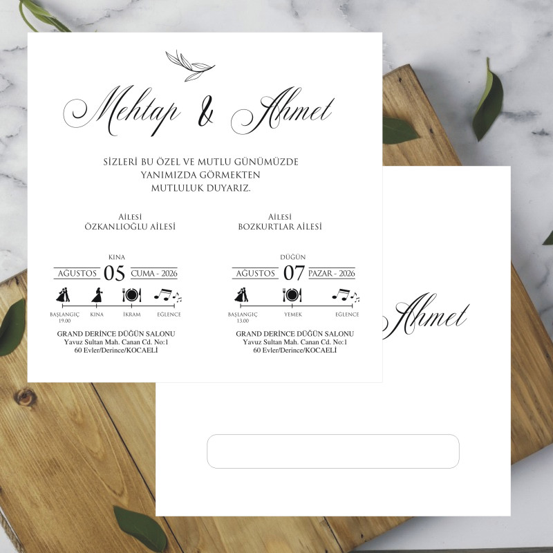 En özel gününüz için şık ve zarif bir davetiye modeli. Kaliteli kağıt ve özenli baskı ile hazırlanan bu ürün, davetinize değer katar.