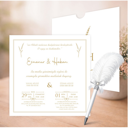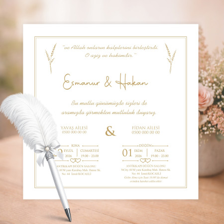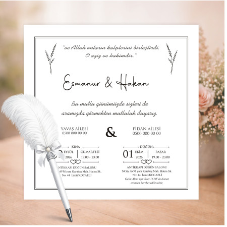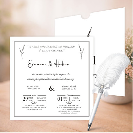 En özel gününüz için şık ve zarif bir davetiye modeli. Kaliteli kağıt ve özenli baskı ile hazırlanan bu ürün, davetinize değer katar.