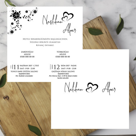 *  Davetiyeler, 220 gr Amerikan Bristol karton üzerine, siyah ofset mürekkep kullanılarak basılmaktadır. Farklı renk veya baskı türü talepleriniz için lütfen bizimle iletişime geçiniz.