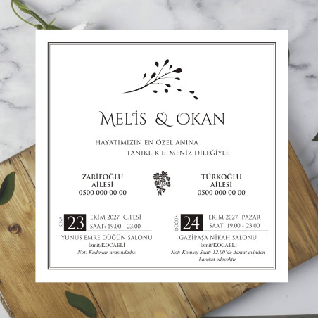 *  Davetiyeler, 220 gr Amerikan Bristol karton üzerine, siyah ofset mürekkep kullanılarak basılmaktadır. Farklı renk veya baskı türü talepleriniz için lütfen bizimle iletişime geçiniz.