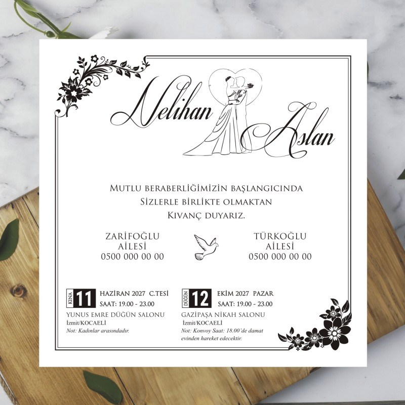 *  Davetiyeler, 220 gr Amerikan Bristol karton üzerine, siyah ofset mürekkep kullanılarak basılmaktadır. Farklı renk veya baskı türü talepleriniz için lütfen bizimle iletişime geçiniz.