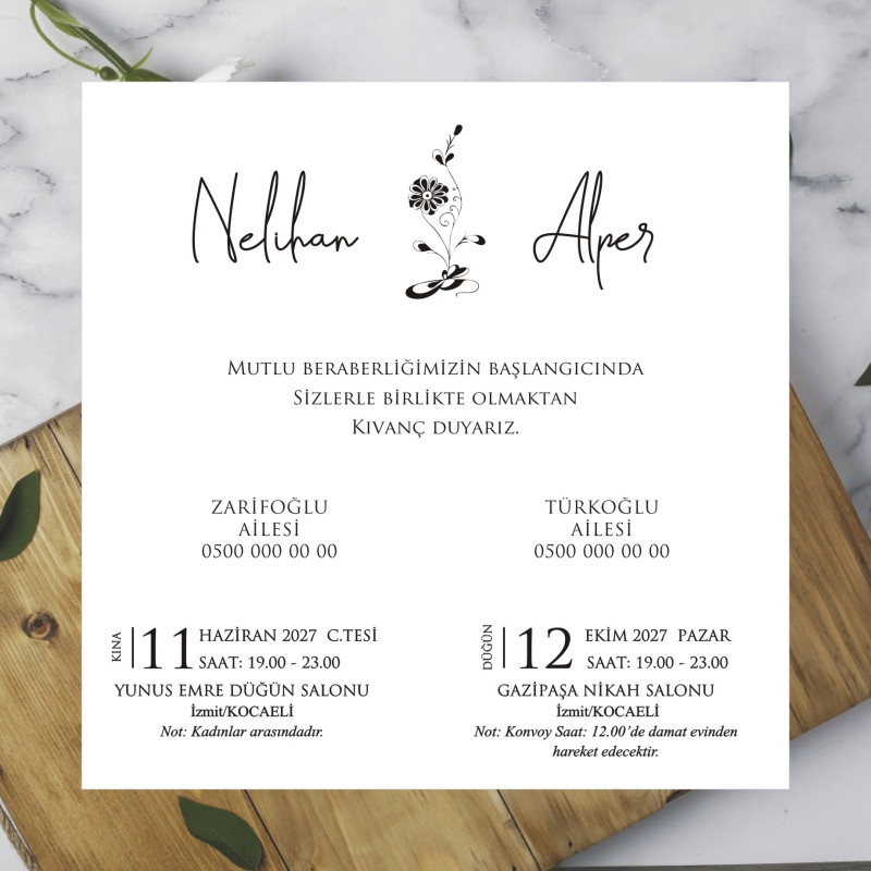 *  Davetiyeler, 220 gr Amerikan Bristol karton üzerine, siyah ofset mürekkep kullanılarak basılmaktadır. Farklı renk veya baskı türü talepleriniz için lütfen bizimle iletişime geçiniz.