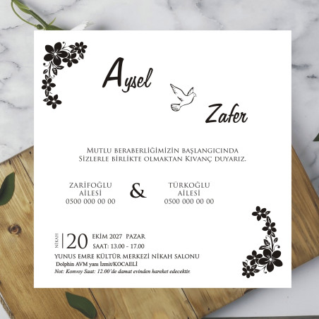 *  Davetiyeler, 220 gr Amerikan Bristol karton üzerine, siyah ofset mürekkep kullanılarak basılmaktadır. Farklı renk veya baskı türü talepleriniz için lütfen bizimle iletişime geçiniz.