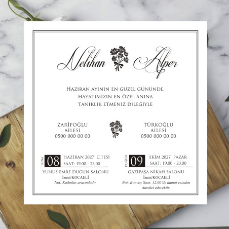 *  Davetiyeler, 220 gr Amerikan Bristol karton üzerine, siyah ofset mürekkep kullanılarak basılmaktadır. Farklı renk veya baskı türü talepleriniz için lütfen bizimle iletişime geçiniz.