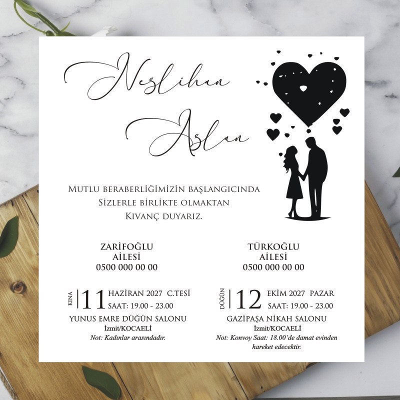 *  Davetiyeler, 220 gr Amerikan Bristol karton üzerine, siyah ofset mürekkep kullanılarak basılmaktadır. Farklı renk veya baskı türü talepleriniz için lütfen bizimle iletişime geçiniz.