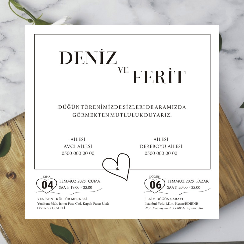 *  Davetiyeler, 220 gr Amerikan Bristol karton üzerine, siyah ofset mürekkep kullanılarak basılmaktadır. Farklı renk veya baskı türü talepleriniz için lütfen bizimle iletişime geçiniz.