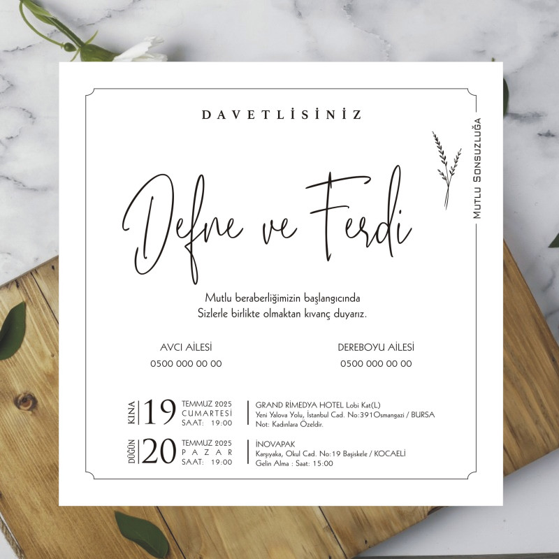 *  Davetiyeler, 220 gr Amerikan Bristol karton üzerine, siyah ofset mürekkep kullanılarak basılmaktadır. Farklı renk veya baskı türü talepleriniz için lütfen bizimle iletişime geçiniz.