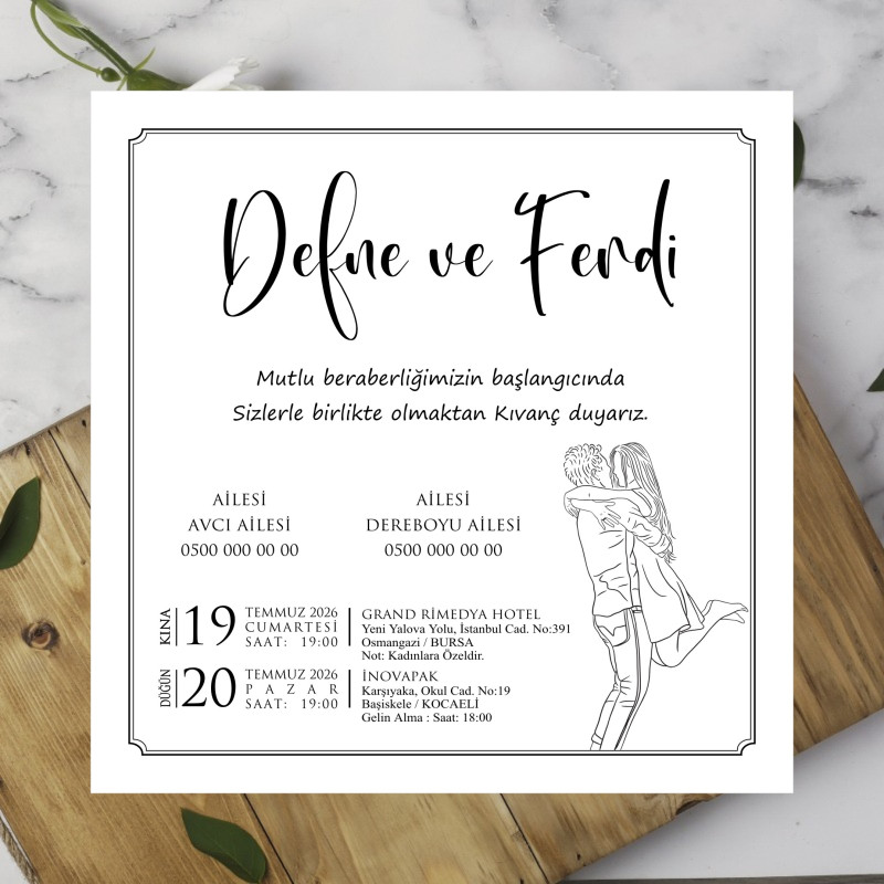 *  Davetiyeler, 220 gr Amerikan Bristol karton üzerine, siyah ofset mürekkep kullanılarak basılmaktadır. Farklı renk veya baskı türü talepleriniz için lütfen bizimle iletişime geçiniz.