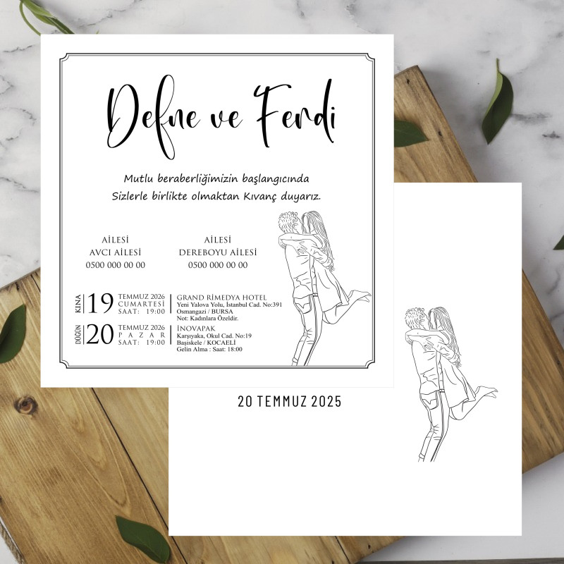 * Davetiyeler, 220 gr Amerikan Bristol karton üzerine, siyah ofset mürekkep kullanılarak basılmaktadır. Farklı renk veya baskı türü talepleriniz için lütfen bizimle iletişime geçiniz.